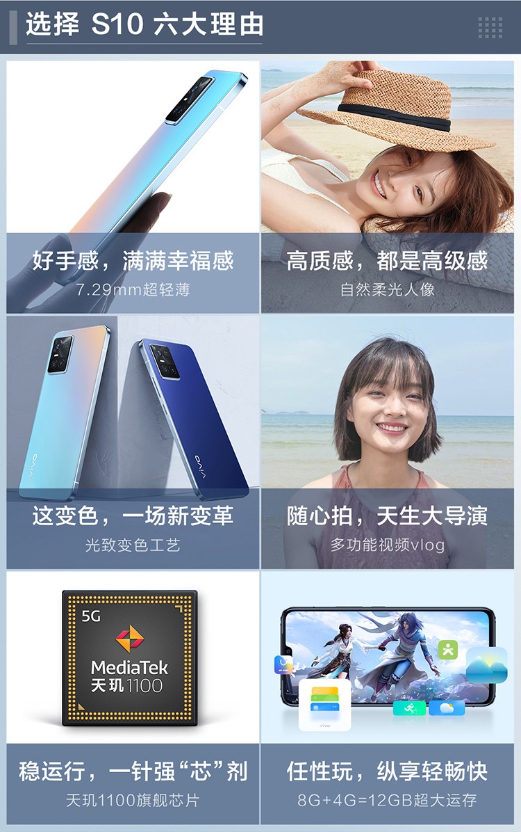 vivo|手机,-vivo S10 5G全网通手机8GB+256GB轻薄自拍旗舰 光致变色工艺 天玑1100旗舰处理器 6400万后置三摄V2121A